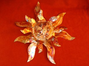 Copper Sun Face with a Gecho hand stamped into the design. Flames are copper with Brass tip flares 19" Diameter. $90.00 |